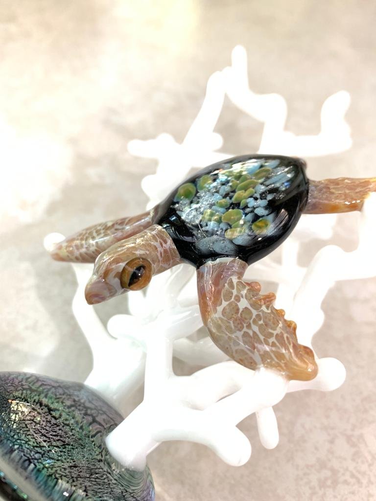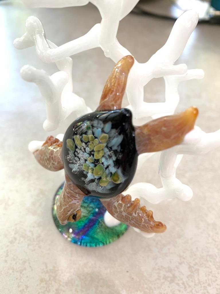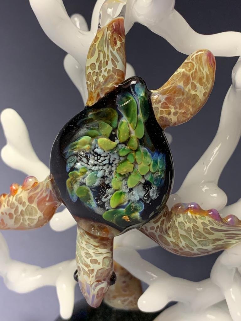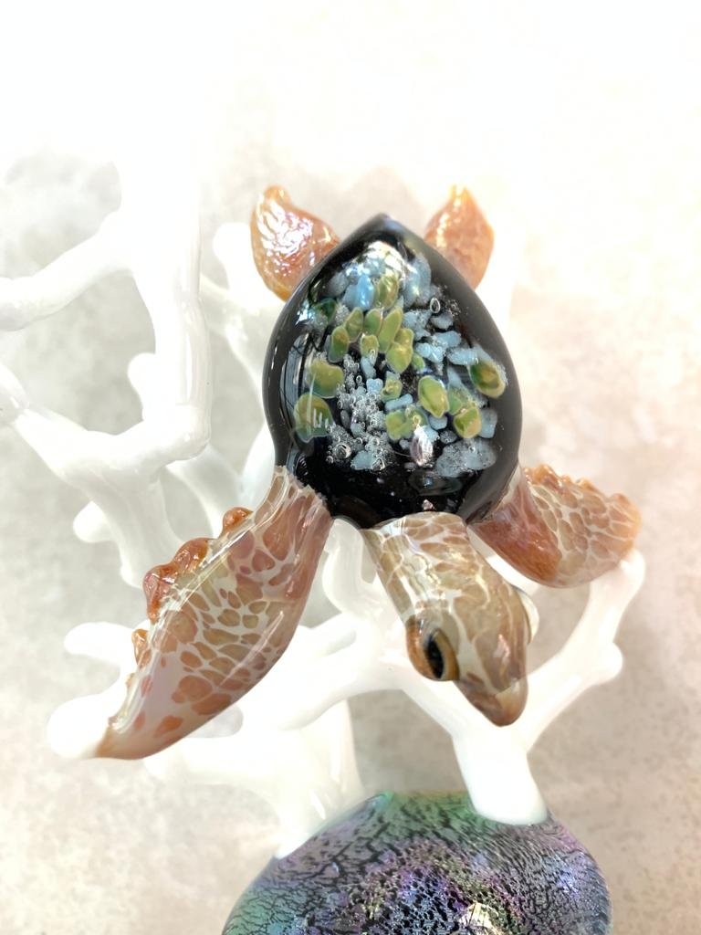 The GLASSnFIRE artists’ designed this with the influence of the shallow, clear waters of the great barrier reef off the coast of Australia, and the incredible loggerhead sea turtles found there. This great loggerhead sea turtle is a combination of two features of the ocean brought together. First, the tidepools are formed when the tides of the ocean are out and leave in rocky areas there are beachfront small pools of water where small creatures of the ocean and many wonderfully colored plants wave back and forth with the movement of the water. This awesome loggerhead sea turtle has a tide pool anemone look inside of its turtle shell.