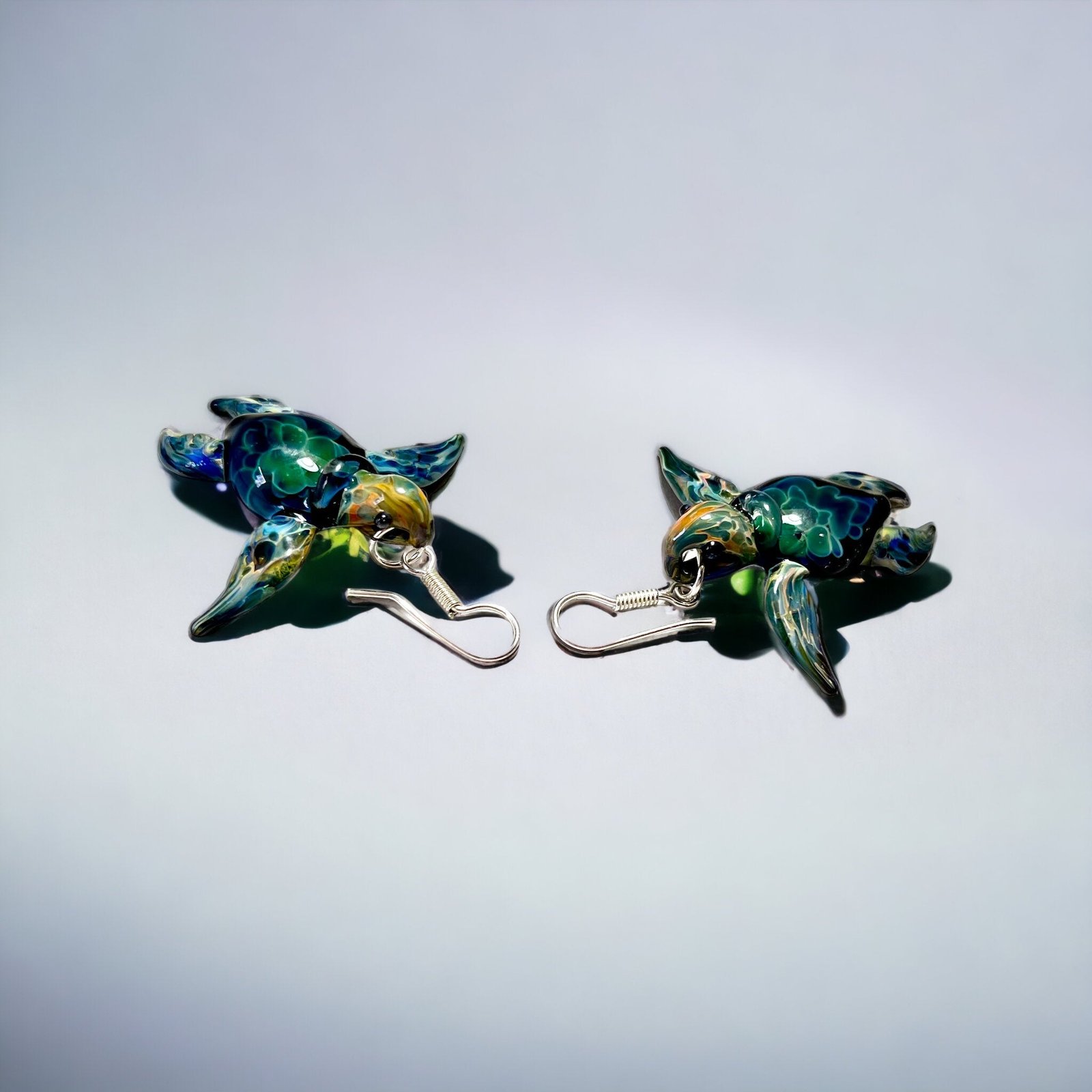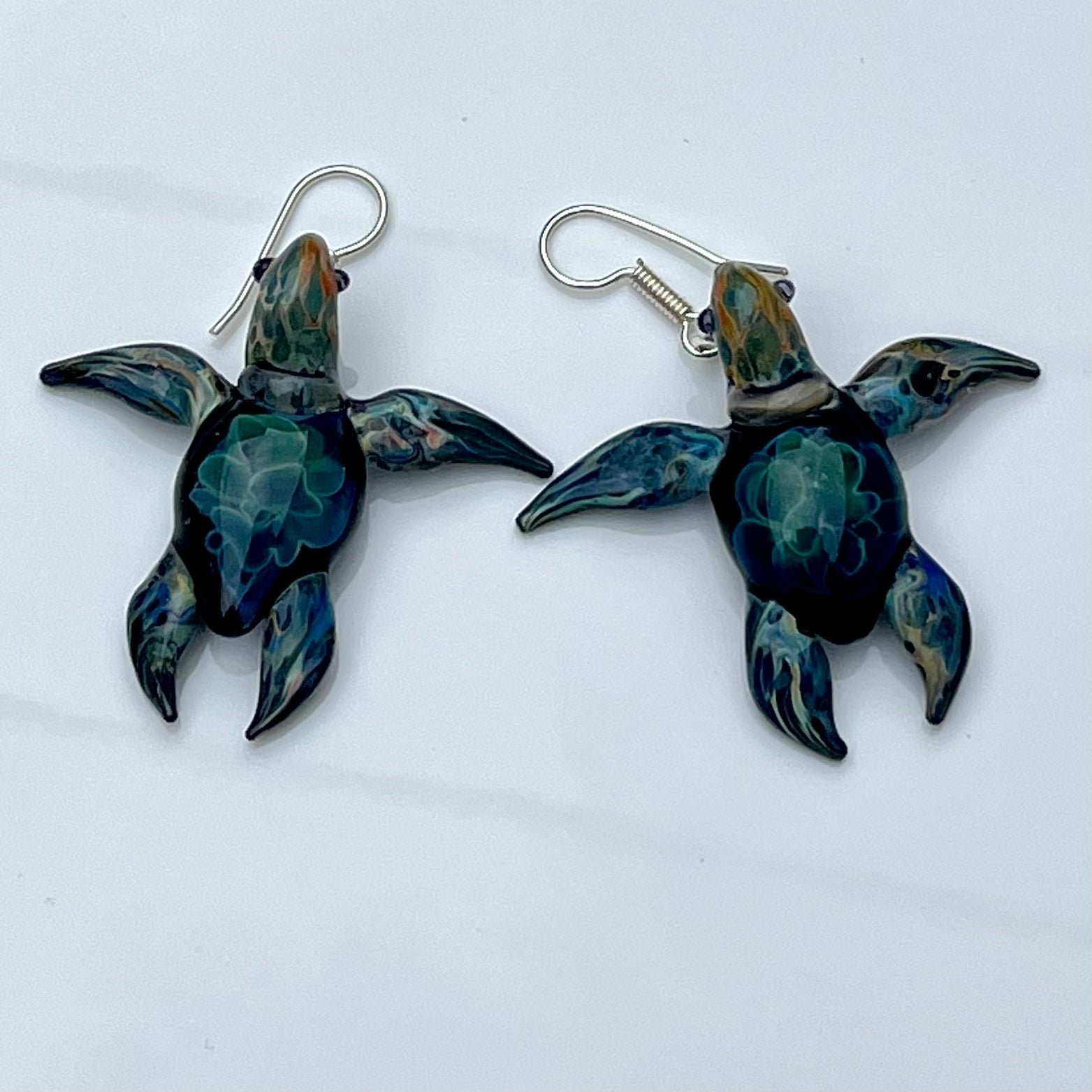 Introducing the Honu (Sea Turtle) Glass Earring Collection – a symbol of longevity and joyful life. Sea turtles have been known to live up to 150 years and play an important role in ocean ecosystems. These earrings feature a beautiful display of tidepools in the turtle’s shell, reminiscent of the small pools of water and colorful plants found on rocky beachfront when the tide is out. Each earring is handcrafted and measures 1 1/2 inches in length and 1 1/2 inches in width. They are connected to high-grade silver 9.25 dangle drop hook earrings. Due to the nature of the glass-blowing process, no two earrings are alike, making each Honu unique with its own color, shape, and overtone. Embrace the beauty of nature with these one-of-a-kind glass earrings.