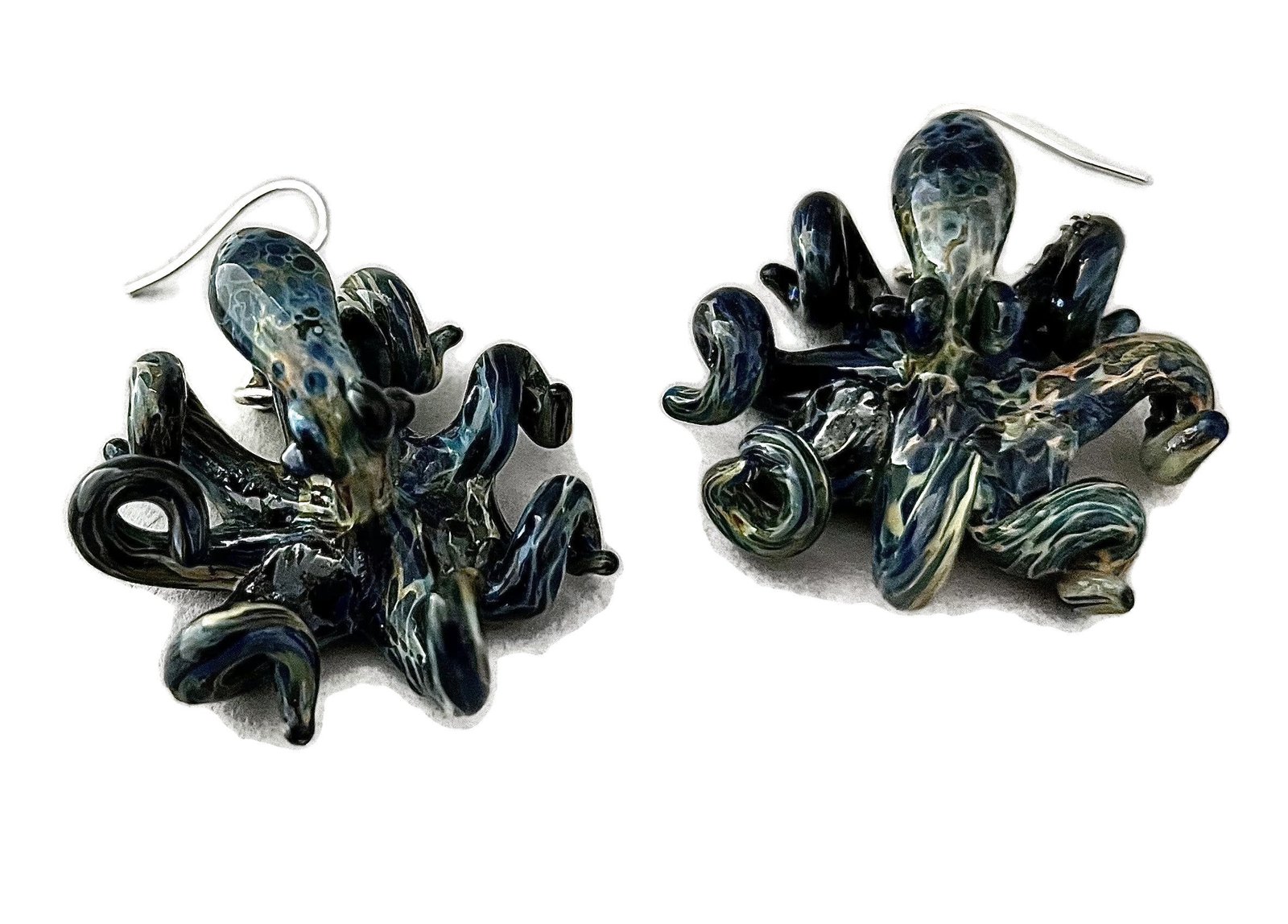 Elevate your accessory game with these stunning handcrafted octopus earrings, made by skilled glass artists. Each 1-inch blown glass octopus boasts a unique and mesmerizing pattern of blues, greens, yellows, and oranges, creating a true work of art. The silver hooks add a touch of elegance to the cool and edgy design, making these earrings a statement piece in any collection. Wear a piece of art with these truly amazing glass creations.